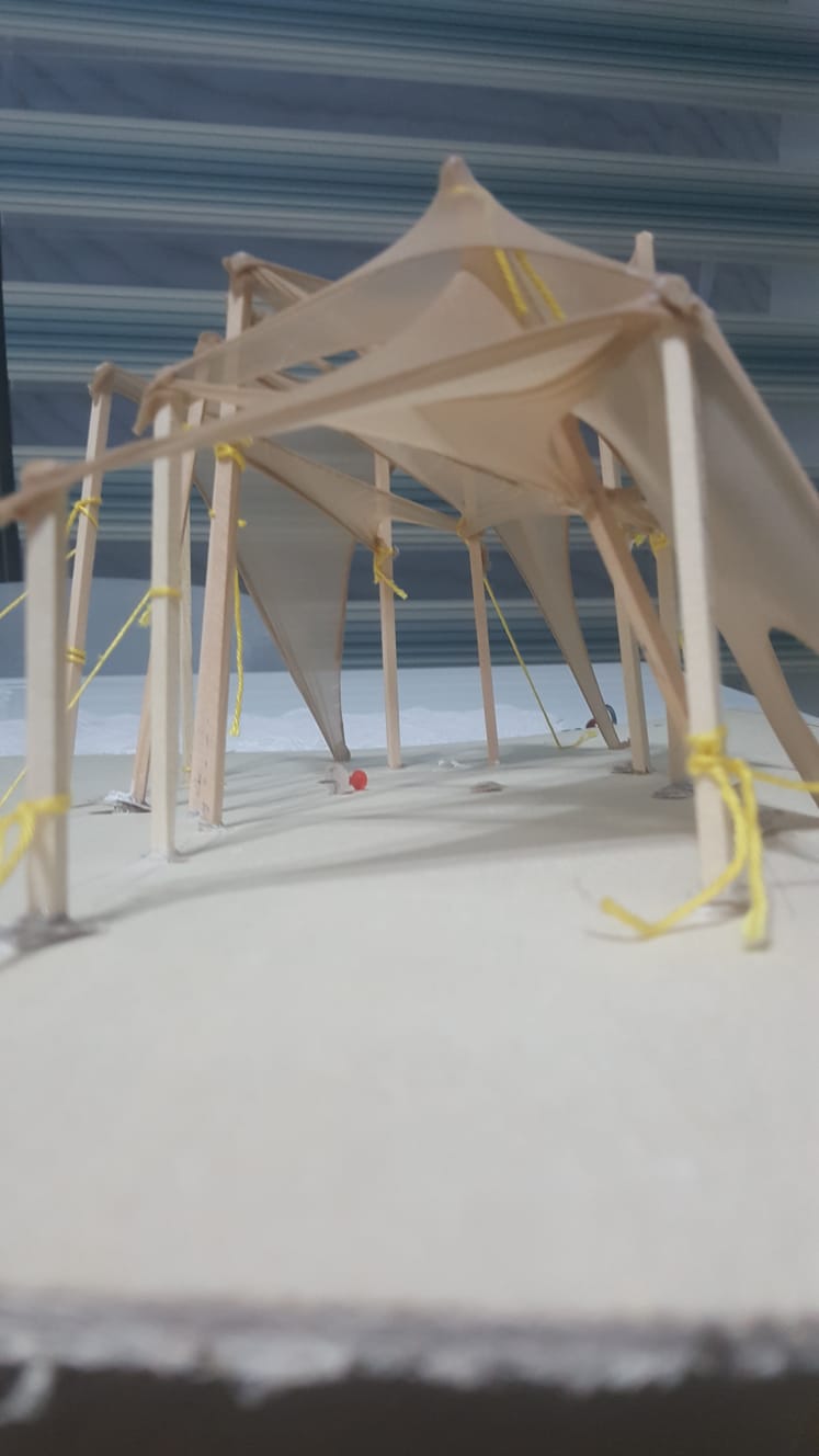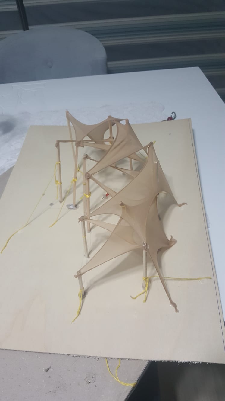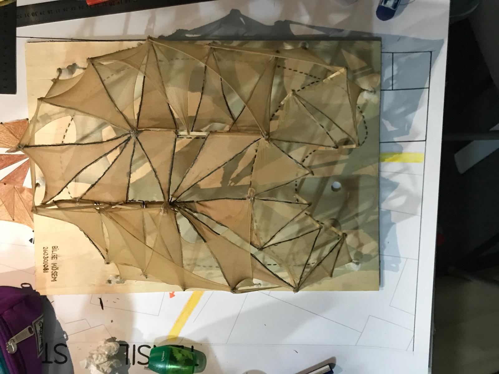 In relation to the site, we developed a design proposal of tensile structure individually. Our structure would cover at least half of the Gülbahçe Square, but would not exceed 2/3 of it. It would provide a shading environment to about 20 people who are standing underneath it for a specific reason that we decided and described. Our structure needed to represent the possibility and space characteristic of the nearby environment as well as represent its architectural durability and will be on a 1/50 scale.